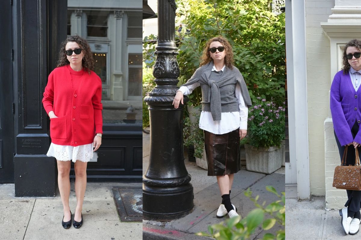 Twinsets need not be worn alone; here, I layered in a button-down to add depth to the overall ensemble. I wore a white Asket shirt beneath the sweater vest, then draped the cardigan around my shoulders. Seemingly unexciting gray knits are some of my favorite pieces to style at the moment; the key is to clash them with something, well, exciting. I did so in the form of an old black and red leather skirt from By Malene Birger and white Suzanne Rae loafers.