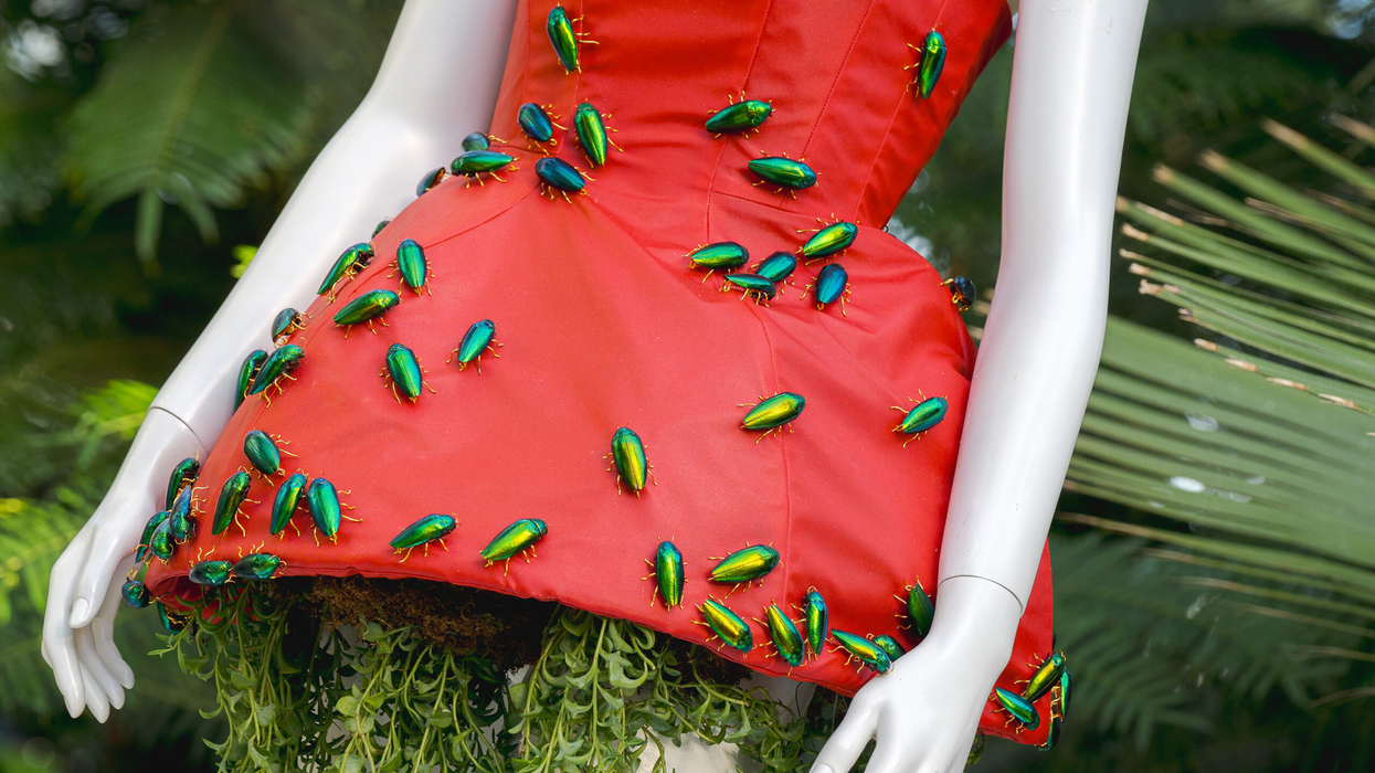 Her job was to spotlight the orchids—Dendrobium, Laelia Superbiens, Lady Slippers, and more niche varieties—hundreds of which are planted around said mannequins. “The idea wasn't necessarily for me to use orchids in my work directly, but to create this sartorial landscape—greenscape, if you will—that orchids could really be highlighted within,” she says. Probing beyond orchids, she employed arid and grass plants, “things that I felt like would be a bit tongue-in-cheek and offset the grandeur and the beauty that is so succinct and natural to orchids and orchid shows.”