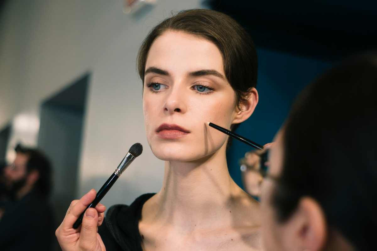Tweed suits, chunky layered knitwear, form-hugging slip dresses: for Ferretti, the aim of her Fall/Winter 2024 collection was to feature pieces that enhance the wearer rather than camouflage them. The makeup took a similar cue. Kanako Takase, lead makeup artist for the show and creative director for Addiction Tokyo, created two natural makeup looks with warmth and color to balance out the cooler tones in the collection. Both looks featured a warm brown lip—Addiction Tokyo The Lipstick Extreme Shine in 017 was pressed onto the lips for a soft stain of color. Then, a few swipes of The Lip Serum were applied over the pigment for a subtle sheen and a lived-in effect. The softer lip shade had a sultry, 90’s feel, especially when paired with the warm smokey eye makeup.